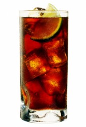 Coloque o Rum e o Refrigerante de Cola dentro do copo com gelo.